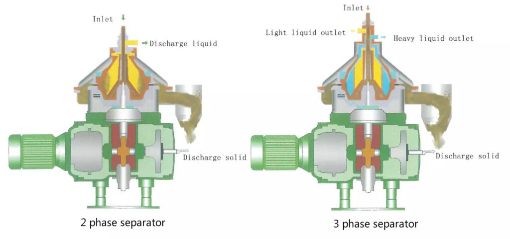The mixture fluid to be processed are fed to the bowl from feeding pipe ,under the effects of centrifugal force, the solids which has heavier density collects on the bowl wall .it include jams and impurities ,collected in sediment holding space .After a while ,the separated soilds are ejected from the bowl at controlling of PLC .the intervals at which de-slugging have to take place depend on the quality of the mixture fluid .De-slugging include automatic de-slugging ,total de-slugging ,partial de-slugging ,Normally customer don’t need total de-slugging ,put up partial de-slugging under the condition of effects of automatic de-slugging are bad .the interval between two partial de-slugging is up to two minutes ,and electric current is normal .then re-establish the automatic de-slugging interval .The lighter products (lower density )flow along the inner side of the discs into the passage in the upper distributor ,the lighter product is discharged from the machine by the centrifugal pump .Thus the mixture fluid is separated well ,the disc centrifuge adopts self de-slugging and centripetal pump .Thus the machine can work continuously for a long time ,attain good separation effects in long run.